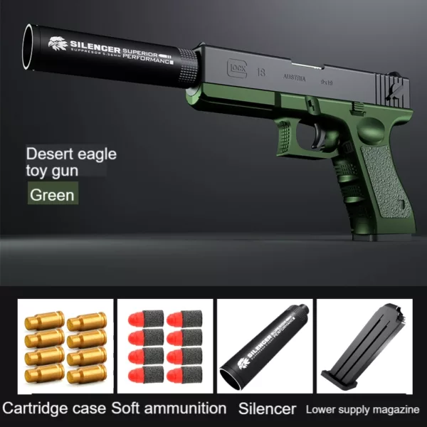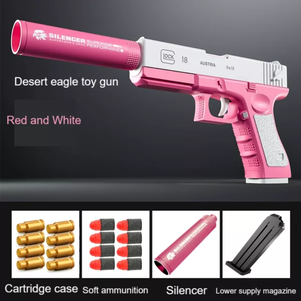 The Desert Eagle Toy Guns are designed for children, modeled after the Desert Eagle, Glock, and 1911 pistols, each distinguished by vibrant colors and realistic features. This toy gun features a striking golden yellow color, textured grips, and a slide mechanism, resembling the exaggerated proportions of the Desert Eagle, making it visually appealing and fun for play. In a sleek gray with black accents, this model mimics a Glock’s compact and reliable design. It includes realistic details like a textured grip and trigger safety, suitable for children who enjoy action-packed play. Vibrantly colored in red with white parts, this toy reflects the classic 1911 pistol design with a single-stack magazine and simplified controls, adding a historical flavor to playtime.