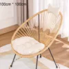 Its sturdy black metal legs angle outward, providing both stability and an elegant contrast to the light, organic material of the seat. A plush, white cushion nestles within the chair’s concave shape, offering a cozy spot for relaxation. Accompanied by a matching rattan side table, perfect for holding a morning cup of coffee or a favorite book, this chair is an ideal retreat for leisurely contemplation or simply basking in the beauty of the outdoors.