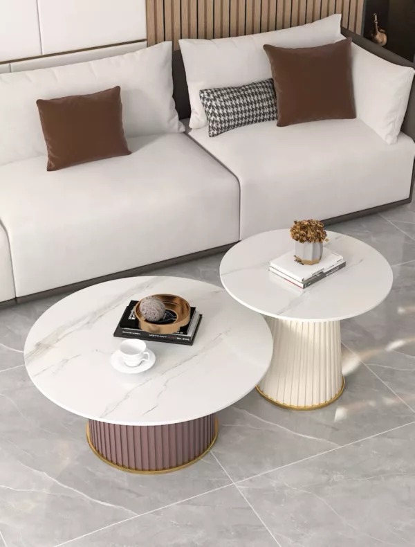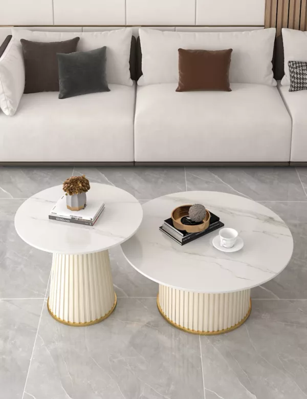 The Circa Harmony Coffee Tables feature a minimalist aesthetic with a touch of luxury. The larger table stands with a pristine white top and fluted ivory base, accented by a golden rim, exuding a classic elegance. Its smaller counterpart, in a bold terracotta hue, offers a striking visual contrast, making the duo a captivating centerpiece for any room.