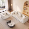 The sofa’s base is low to the ground, reinforcing a sense of stability and groundedness, while the armrests rise gently on either side, their curvature offering a natural place to rest. The absence of visible legs contributes to the sofa’s modern aesthetic, giving it a floating appearance that enhances the airy, cloud-like feel.