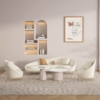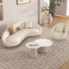 The sofa is upholstered in a plush, cream-colored fabric that is both soft to the touch and durable for daily use. Its body-hugging form is gracefully extended into a semi-circular shape, providing ample seating without sacrificing elegance. The seat is designed to offer a deep and enveloping feel, encouraging relaxation and social interaction.