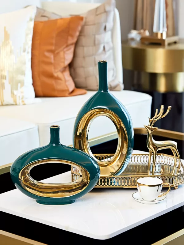 These artful accents, known as the “Silver Orbit Vase Collection,” are a stunning pair of decorative vases that bring a futuristic touch to classic decor. Each vase is characterized by a mesmerizing silver finish with a textural surface that evokes the feeling of an unearthed treasure. The unique feature of each vase is the bold, circular void at its heart, giving the illusion of a suspended ring and creating an eye-catching play of light and shadow.