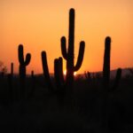 Dark cactuses in the sunlight , their thorns aglow with gentle black light.