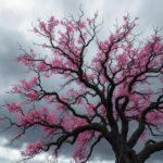 Witness a striking tableau where gnarled ancient branches shimmer with glowing pink leaves beneath a tempestuous grey sky. The contrast of vitality against storminess evokes resilience and the enduring beauty of nature’s cycles.