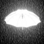 Vibrant white shelter shines amid a storm of black-and-white rain.