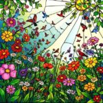 A vibrant stained-glass scene of a sunlit garden bursting with colorful flowers, lively birds, and lush greenery.
