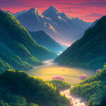 This breathtaking illustration captures the serene majesty of a hidden valley bathed in the golden hues of twilight.